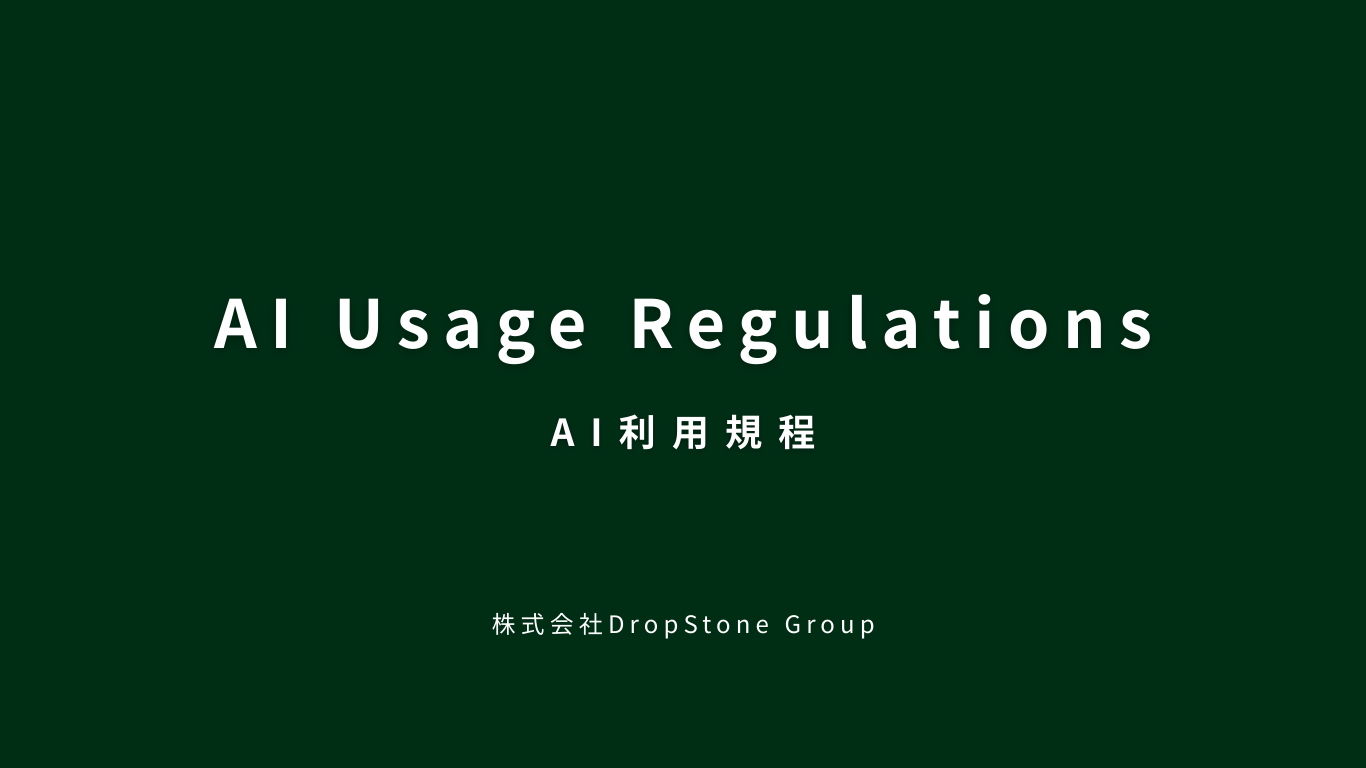 本規程は、株式会社DropStone Group(以下「当社」)およびグループ各社における生成AIおよび関連AIツールの利用を最大限促進しつつ、情報漏えい、法令違反、品質事故および信用毀損を防止することを目的とする。